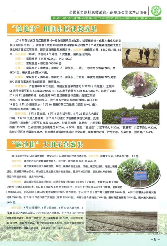 2014年8月21日,“2014年新型肥料肥效試驗(yàn)現(xiàn)場(chǎng)培訓(xùn)在甘肅張掖市召開(kāi)”。來(lái)自全國(guó)各省、市相關(guān)技術(shù)人員共計(jì)100余人參加培訓(xùn)。成都華宏生態(tài)農(nóng)業(yè)科技有限公司總經(jīng)理李智強(qiáng),攜公司高管參加了這次培訓(xùn)。與會(huì)人員還參觀了全國(guó)農(nóng)技推廣服務(wù)中心在全國(guó)選出的七個(gè)新型肥料品種在張掖市的試驗(yàn)示范。成都華宏生態(tài)農(nóng)業(yè)科技有限公司自主研發(fā)的“施地佳”土壤調(diào)理劑也被安排在甘州區(qū)烏江鎮(zhèn)賈寨村一社趙建國(guó)的承包地試驗(yàn),試驗(yàn)作物是玉米。根據(jù)田間記載:4月22日播種,5月2日出苗,6月10進(jìn)入拔節(jié)期,6月25日進(jìn)入大喇叭口區(qū)期。7月18日進(jìn)入抽穗期。于7月3日進(jìn)行示范田植株性狀調(diào)查,施用“施地佳”土壤調(diào)理劑,大田平均株高135.5cm,較對(duì)照區(qū)增高10.1cm,莖粗為9.3cm,均較對(duì)照區(qū)增粗0.5cm,施用“施地佳”土壤調(diào)理劑后,示范田苗齊苗壯、植株葉色濃綠,長(zhǎng)勢(shì)較強(qiáng)。預(yù)計(jì)增產(chǎn)5—6%。
