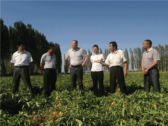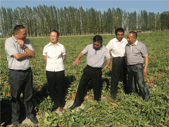 圖為:農(nóng)二師科技局馮局長(zhǎng)、21團(tuán)韓團(tuán)長(zhǎng)、趙科長(zhǎng)與成都華宏生態(tài)農(nóng)業(yè)科技有限公司李智強(qiáng)總經(jīng)理來(lái)到加工番茄試驗(yàn)地查看番茄長(zhǎng)勢(shì)。