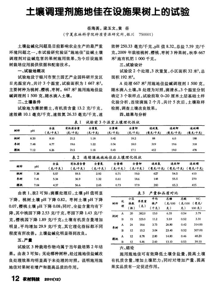《農(nóng)村科技》2011年12期 土壤調(diào)理劑“施地佳”在設(shè)施果樹上的試驗