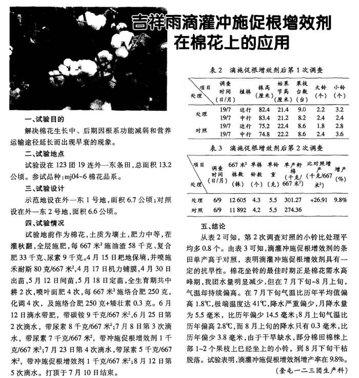 《農(nóng)村科技》2007年第4期 “吉祥雨”滴灌沖施促根增效劑在棉花上的應用