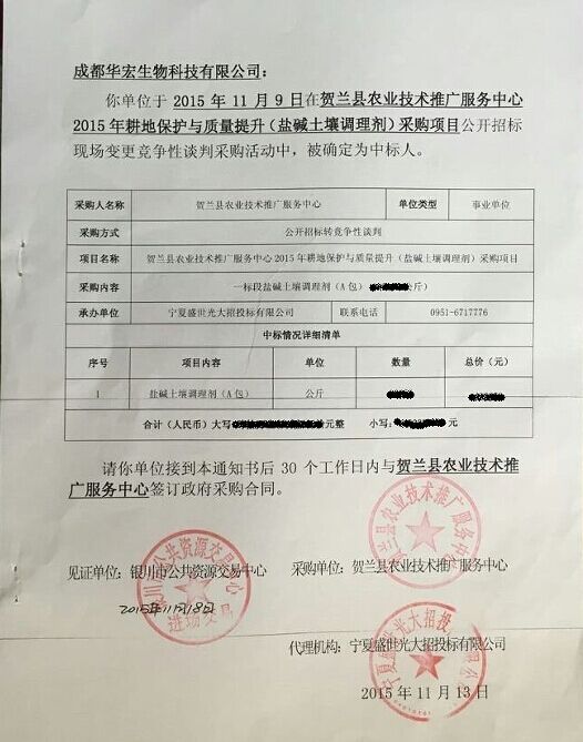 不久前,國內(nèi)土壤調(diào)理劑產(chǎn)品研發(fā)生產(chǎn)先導(dǎo)型企業(yè)——成都華宏生態(tài)農(nóng)業(yè)科技有限公司,收到了一份特別的通知書,“賀蘭縣政府采購”幾個大字分外顯眼,無不讓人感覺這份通知書的分量十足。筆者了解到,這是該企業(yè)參與賀蘭縣農(nóng)業(yè)技術(shù)推廣服務(wù)中心“2015年鹽堿土壤調(diào)理劑采購項(xiàng)目”投標(biāo)的中標(biāo)通知書,該通知書的取得也意味著成都華宏在同類投標(biāo)中連續(xù)四年中標(biāo),如此傲人的成績在業(yè)內(nèi)還不多見。