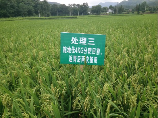 處理二中,農(nóng)民在采用習(xí)慣施肥方式的基礎(chǔ)上,每hm2使用施地佳調(diào)理劑60公斤,在插秧前耙地時(shí)間節(jié)點(diǎn)一次性兌水潑灑在田里耙地后插秧。