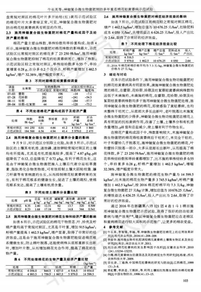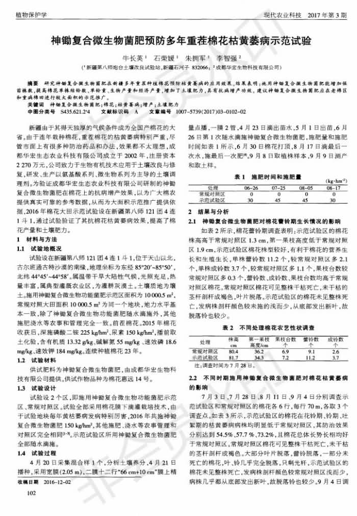 神鋤復(fù)合微 生物菌肥預(yù)防多年重茬棉花枯黃萎病 示范試驗